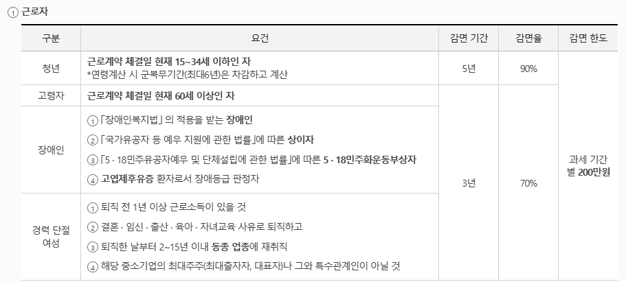 : 청년 등이 일정 요건을 충족하는 중소기업에 취업하는 경우, 취업 일로부터 3년(5년) 이 되는 날이 속하는 달의 말일까지 발생한 소득에 대한 소득세의 일정률을 가면 받을 수 있는 제도를 말한다.