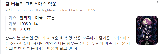 애니메이션 영화 ‘팀 버튼 크리스마스의 악몽’(이하 ‘크리스마스의 악몽’)이 1993년 북미 개봉 30주년 기념해 극장에서 재개봉한다고 한다.